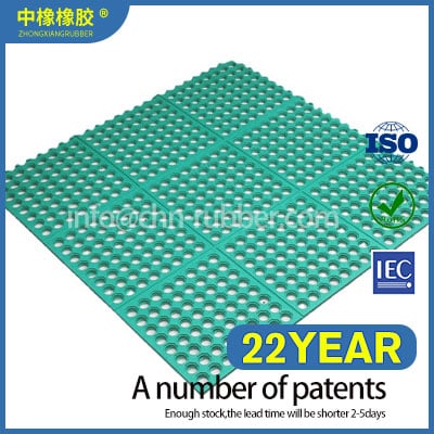 Rubber anti fatigue mat with holes produced by weaving together multiple strands of material. The center of the mat is typically left open, creating a hole that can be used for various purposes. For example, a hollow mat can be placed over a door to help keep out drafts, or it can be used as a portable sleeping mat. Hollow mats are also often used for storage, as the hole in the center of the mat can be used to store items such as blankets or towels.